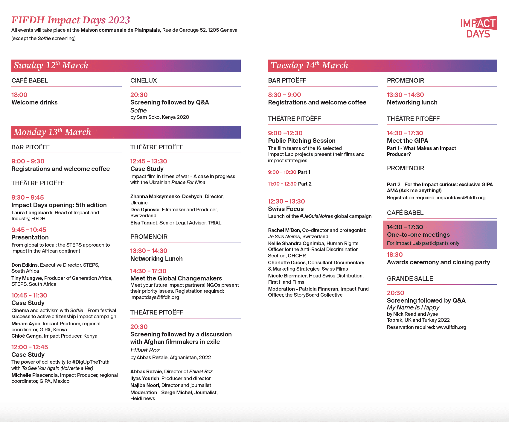 Les Impact Days, organisés par le Festival du film et forum international sur les droits humains à Genève, représentent une étape cruciale au-delà de la simple sensibilisation. Cet événement de grande envergure offre aux participants une opportunité unique de passer à l’action pour soutenir activement les droits humains. Pendant les Impact Days, des ateliers, des conférences et des sessions interactives sont organisés, rassemblant des experts, des activistes et des citoyens engagés qui partagent une volonté commune de faire une différence positive dans le monde. Les participants sont encouragés à explorer des solutions pratiques et innovantes pour faire face aux défis les plus pressants en matière de droits humains. Ces journées d’impact offrent également un espace pour la collaboration et le réseautage, permettant aux participants de former des alliances stratégiques et de renforcer leur engagement envers la protection et la promotion des droits fondamentaux de tous les individus.